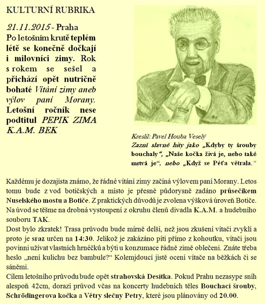 Sraz je určen na 21.11. ve 14:30. Jelikož je zakázáno píti přímo z kohoutku, vítači jsou povinni užívat vlastních hrnéčků a býti u konzumace řádně zimě oblečeni. Znáte třeba heslo „není kulichu bez bambule?“ Kolemjdoucí jistě ocení vítače na běžkách či se sáněmi.